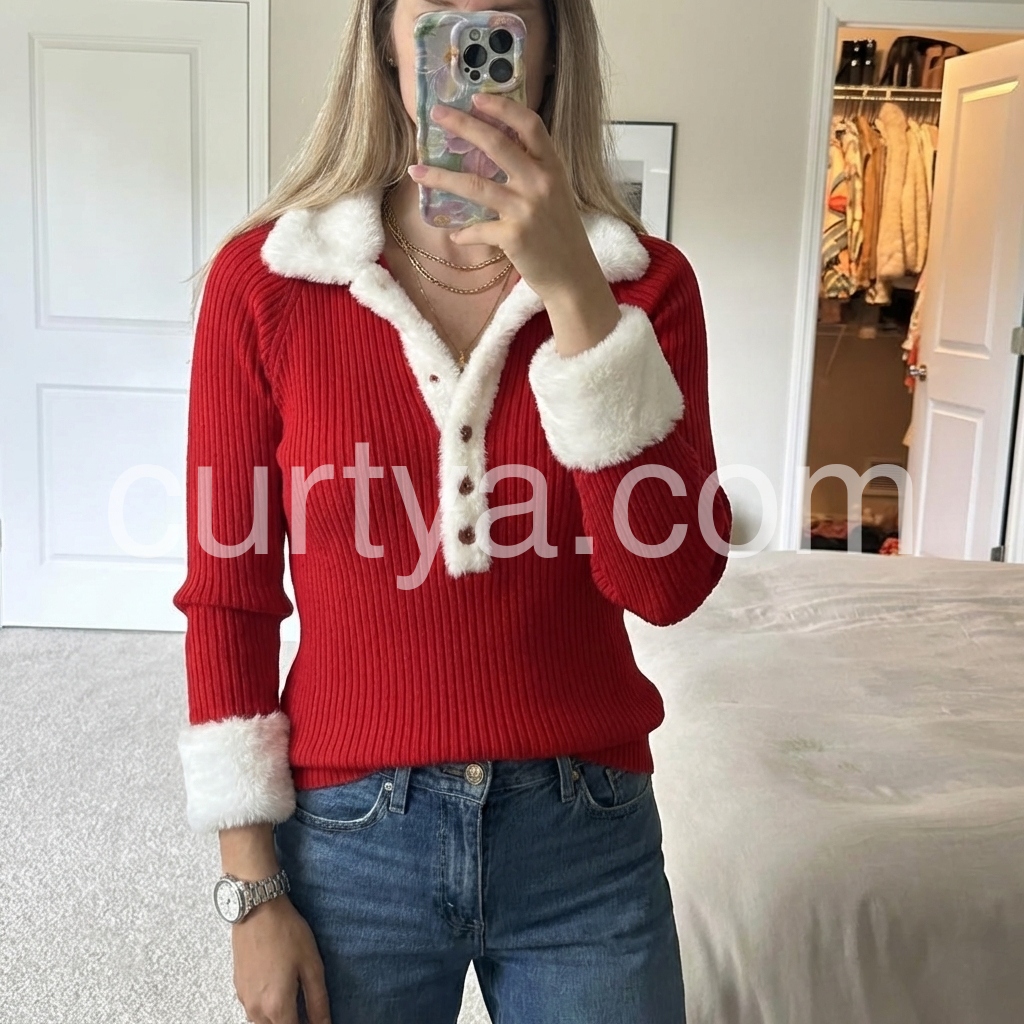 This red ribbed top features a striking color block design and a faux fur trim that adds a touch of luxury to everyday wear. Equipped with button-front closure, it allows for versatile styling and easy layering. The ribbed fabric offers a comfortable, form-fitting silhouette, making it ideal for both casual and polished looks.