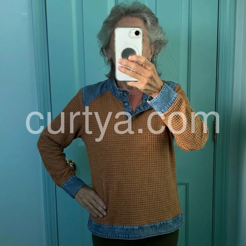 Crafted from premium denim, this long sleeve top features a sophisticated brown color block design that adds visual interest and versatility to your wardrobe. The structured fabric provides durability and maintains its shape through regular wear, while the extended sleeves offer practical coverage. The color blocking technique creates a modern silhouette that works seamlessly with both casual and elevated styling. Perfect for layering or wearing as a standalone piece, this top delivers timeless appeal with contemporary flair.