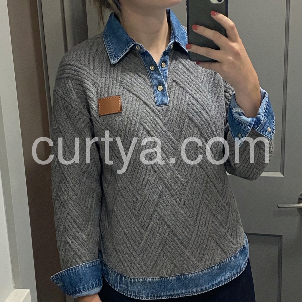 Elevate your casual wardrobe with this sophisticated grey herringbone knit sweater, featuring a distinctive denim collar that bridges the gap between refined knitwear and relaxed styling. The herringbone texture adds visual depth and dimension, while the contrasting denim collar provides a contemporary edge perfect for layering or wearing standalone. Crafted for versatility, this piece transitions seamlessly from weekend wear to smart-casual settings, offering both comfort and polished appeal.