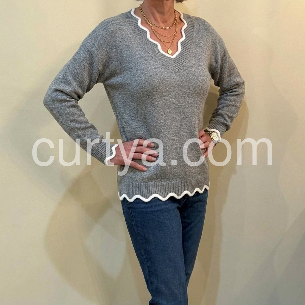 This grey sweater features a soft ribbed texture, combining comfort with subtle sophistication. The delicate white ruffle trim adds a refined, feminine touch, elevating a classic knit into a versatile wardrobe staple that transitions seamlessly from casual to polished looks. Ideal for layering or wearing alone, it offers both warmth and style with an expert-crafted design.