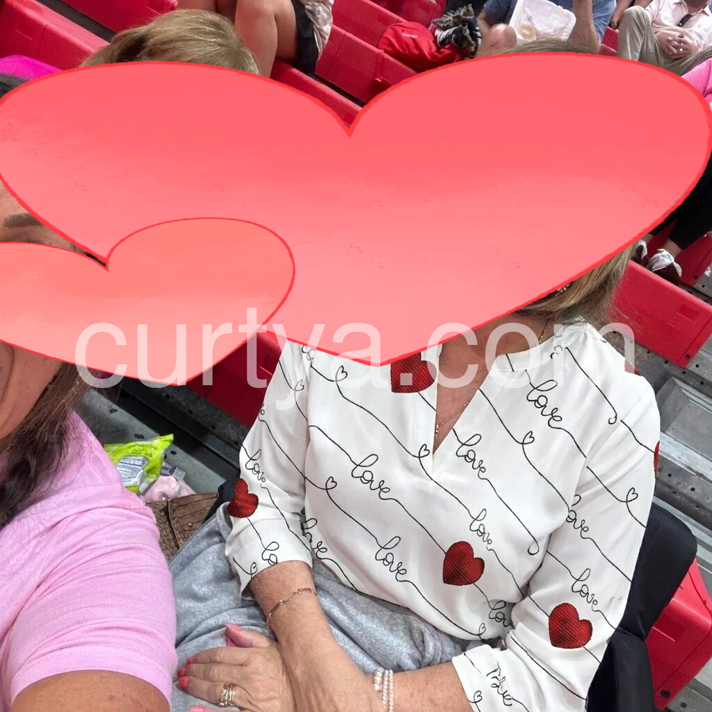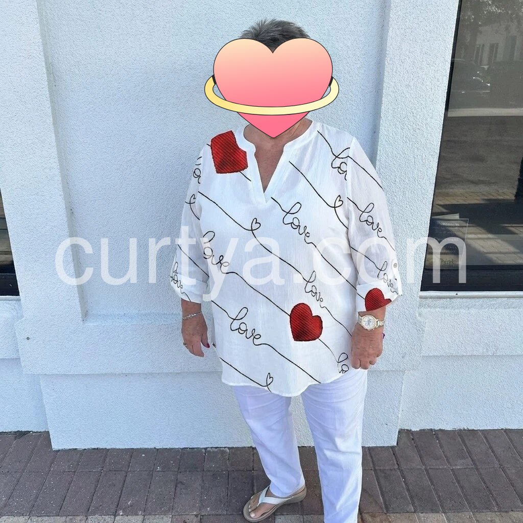 Wear your heart on the sleeve with this adorable white top featuring long sleeves and a round collar v-neck top. The word LOVE and scribbly lines tell a tale of romance in chic style, peppered with red hearts for color. Get ready for Valentine's Day with this sweet top, also for year-round.