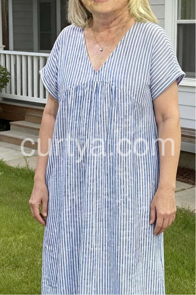 Youthful Striped Print V-Neck Midi Dress