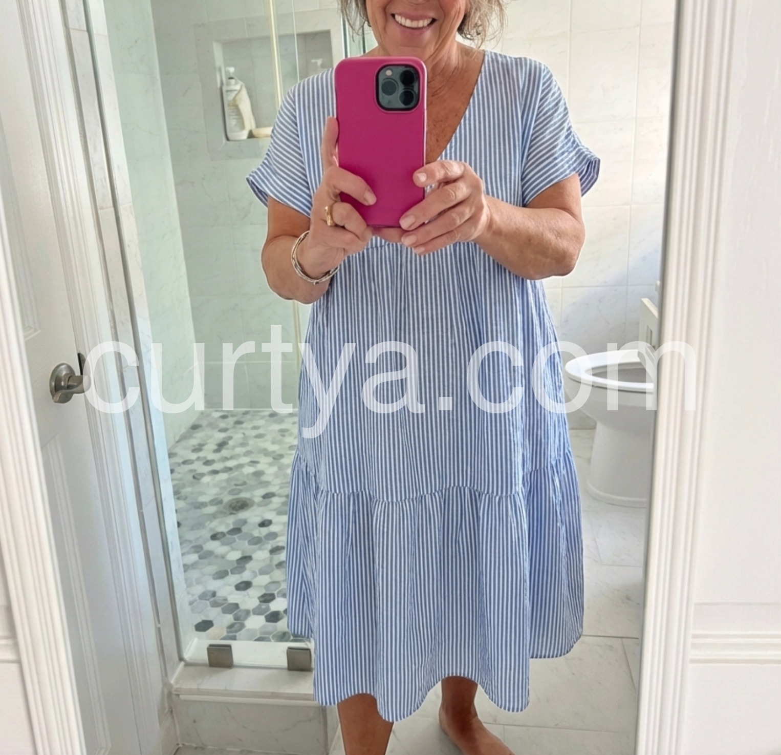 This Youthful Striped Print V-Neck Midi Dress is designed for the modern fashion-forward woman. Made with a flattering V-neckline and eye-catching striped print, this dress is versatile and perfect for any occasion. Its midi length adds a touch of elegance, while the youthful design adds a playful touch. Elevate your wardrobe with this must-have dress.