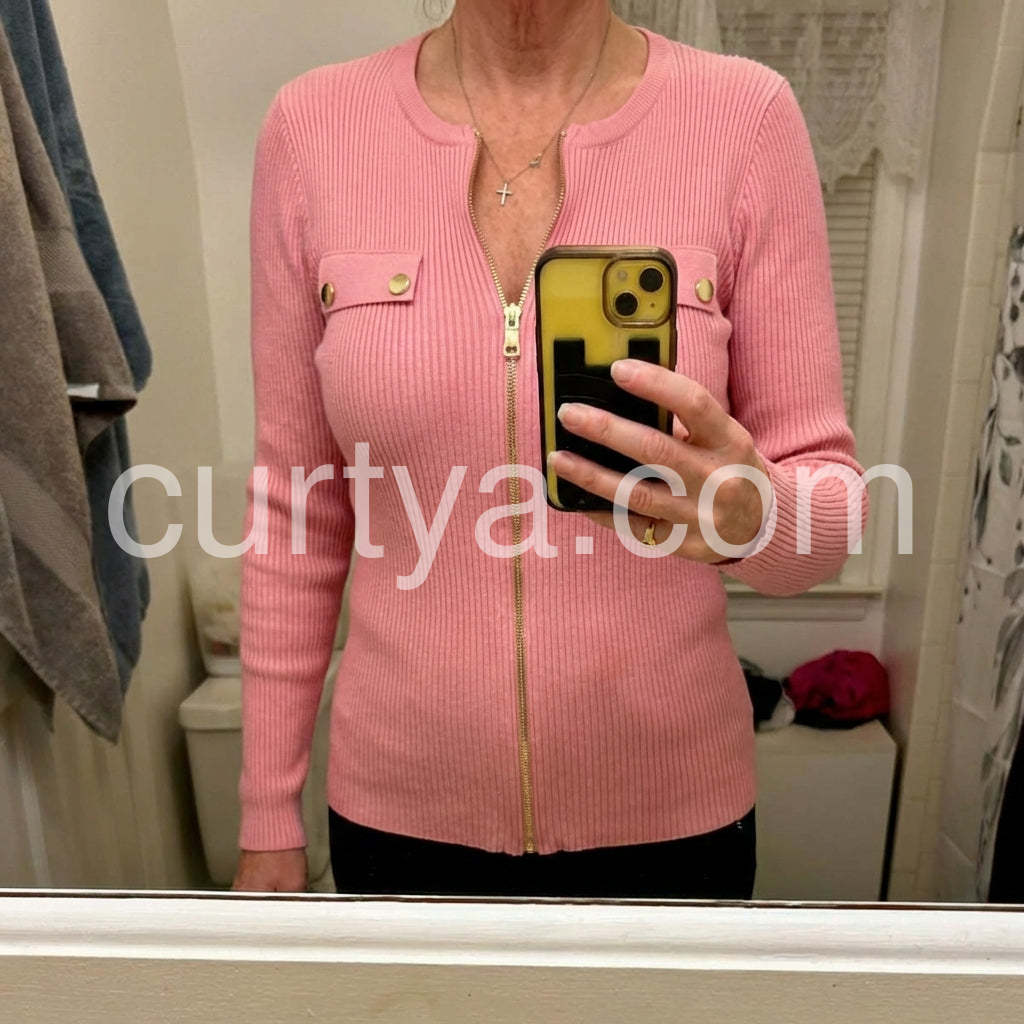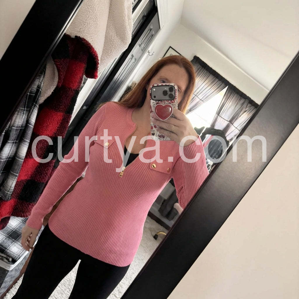 Elevate your wardrobe with our Sweet Pink Plain Zip V-Neck Knit Top. The soft knit material's luxurious feel makes it perfect for all-day comfort, while the modern V-neck and zip design adds a touch of sophistication. Upgrade your style with this classic and versatile top.