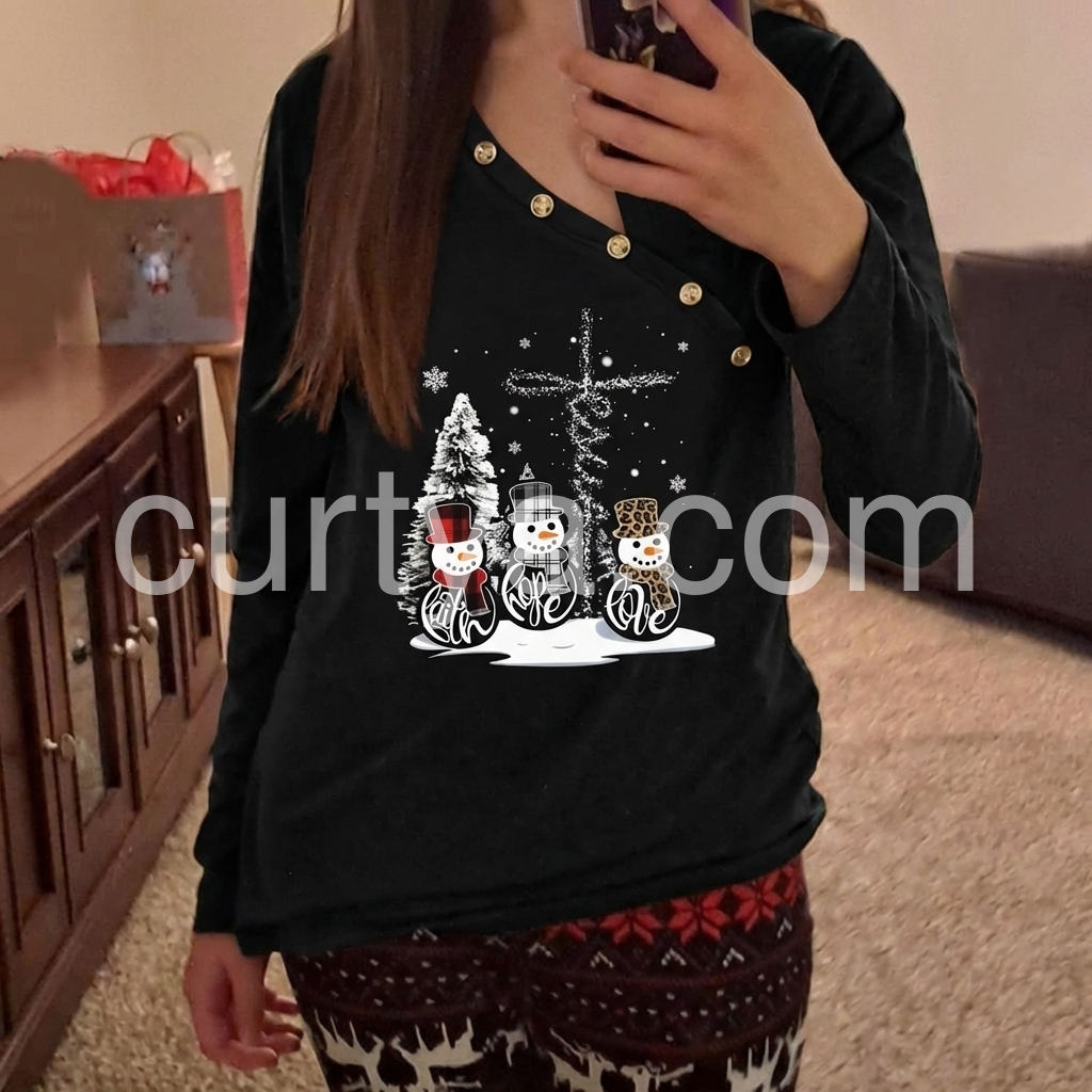 Add this cozy long sleeve top to your winter wardrobe, featuring adorable snowmen and a Cross, a Christmas tree, and falling snowflakes that set the stage for a super-fun holiday party, Christmas vacation, and so much more. An asymmetrical button front collar gives it a contemporary vibe.