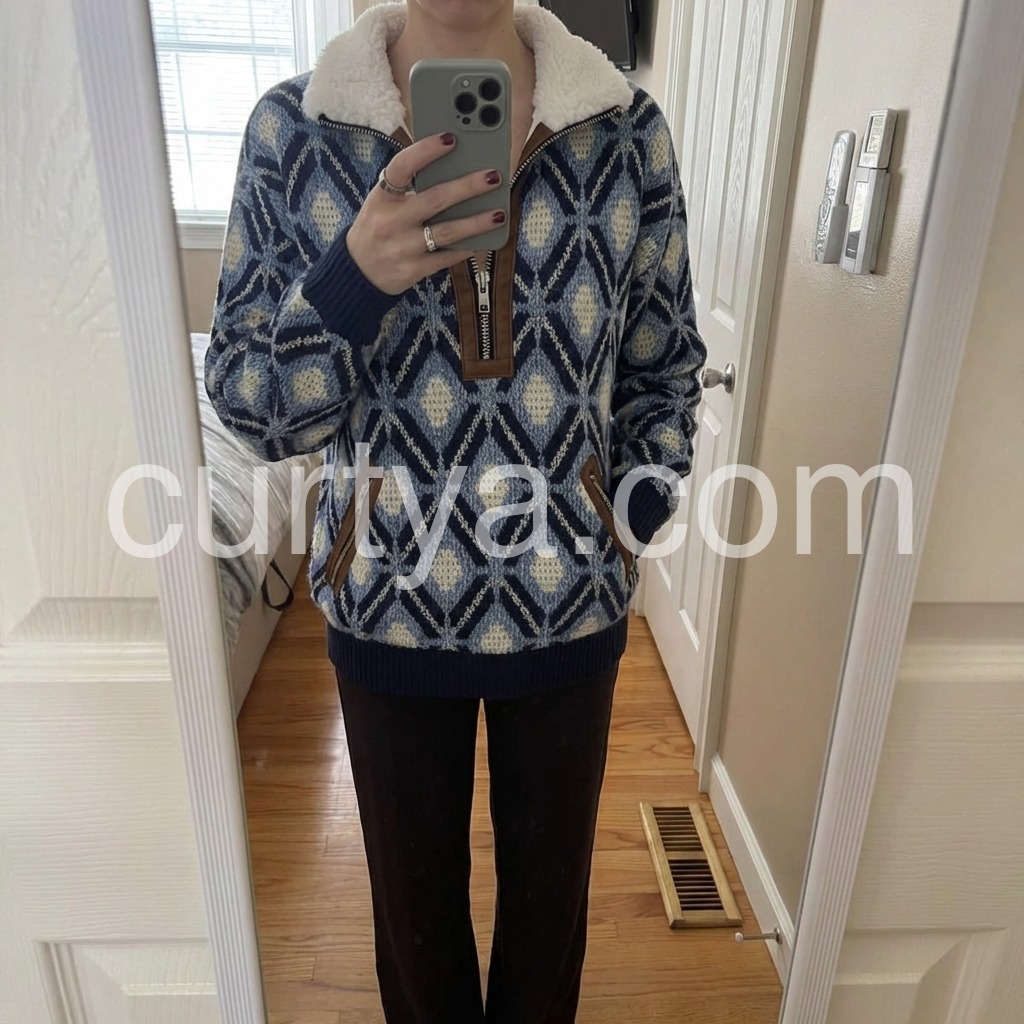 Elevate your cold-weather wardrobe with this sophisticated knit sweater, featuring a striking blue geometric pattern that adds visual interest to any ensemble. The fleece lining provides exceptional warmth and comfort, making it an ideal choice for layering or standalone wear during transitional seasons. Crafted from quality knit fabric, this piece combines contemporary design with practical functionality. The geometric detailing brings modern flair while maintaining versatility—pair it effortlessly with jeans, trousers, or skirts for polished everyday styling.