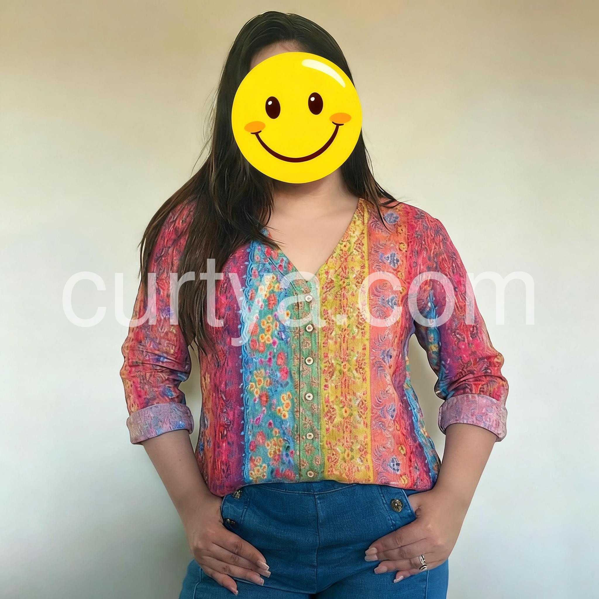 Embrace free-spirited style with this Stunning Colorful Boho Print Top, a vibrant and eye-catching piece that brings bold artistry to everyday wear. Crafted from lightweight, breathable fabric—likely cotton or rayon blend—this long-sleeve tunic features a richly detailed print combining floral motifs, paisley patterns, and vertical stripes in a lively mix of fuchsia, turquoise, mustard yellow, and deep purple. The relaxed, flowy silhouette drapes beautifully, offering comfort and ease while the V-neckline and front button closure add a touch of classic structure. With sleeves that roll up easily for a casual look, it’s perfect for pairing with jeans, leggings, or flowy pants. Styled here with layered necklaces and bracelets, it captures the essence of bohemian elegance with a modern twist. Ideal for weekend outings, summer days, or adding a burst of personality to your wardrobe, this tunic top celebrates color, culture, and effortless charm. Let your style shine with this joyful, artistic statement piece.
